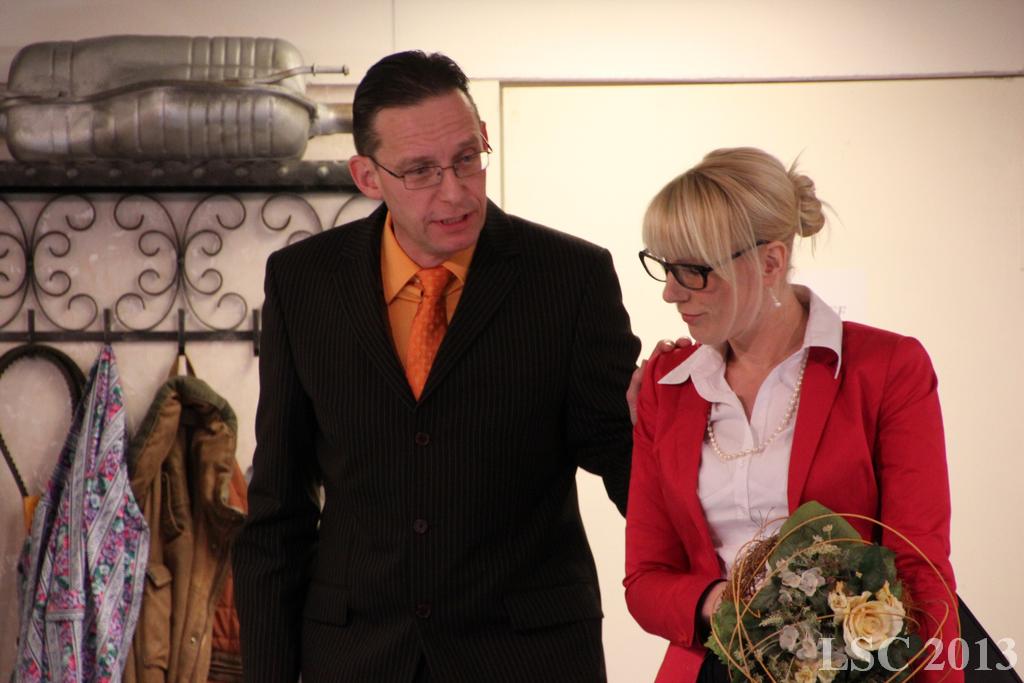 Bild 132Als Bankdirektor Dr. Profitlich dem kleinen Werkstattbesitzer gerade finanziell den "Garaus" machen will, Dr. Profitlich und Bürgermeisterinkommt eine neue verrückte "Erfindung" von Matthias gerade zur rechten Zeit, um das Blatt zu wenden.